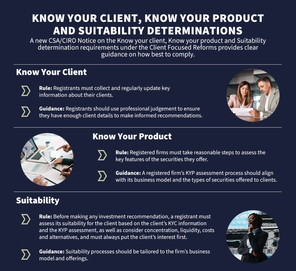A new CSA/CIRO Notice on the Know your client, Know your product and Suitability determination requirements under the Client Focused Reforms provides additional guidance for registrants on how best to ensure compliance.