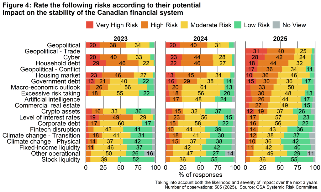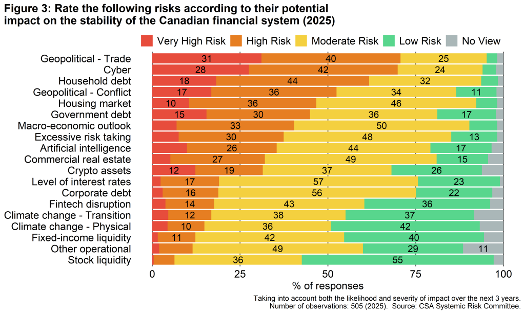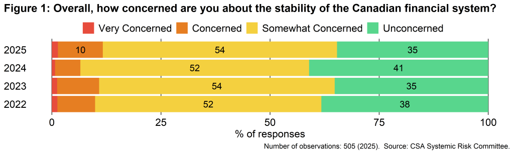 - Survey responses provide the CSA with critical information on market participants’ concerns about the stability of the Canadian financial system. These results are a key input into the CSA’s ongoing efforts to monitor financial vulnerabilities and promote financial stability.