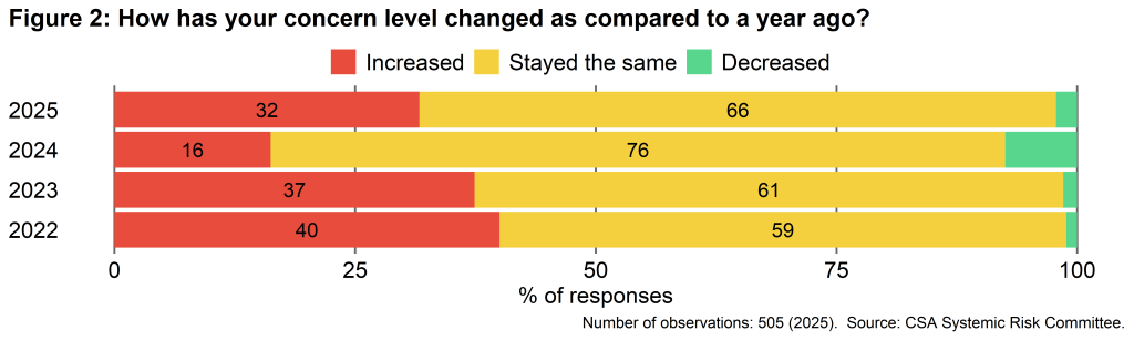 - Concern about financial stability risks has increased since last year. Some 65% of respondents indicated that they were Somewhat to Very Concerned about the stability of the Canadian financial system. That compares to 59% in last year’s survey, which was conducted just before the U.S. election. While concern levels this year are higher than in 2024, they are broadly in line with 2023 levels (Figure 1).