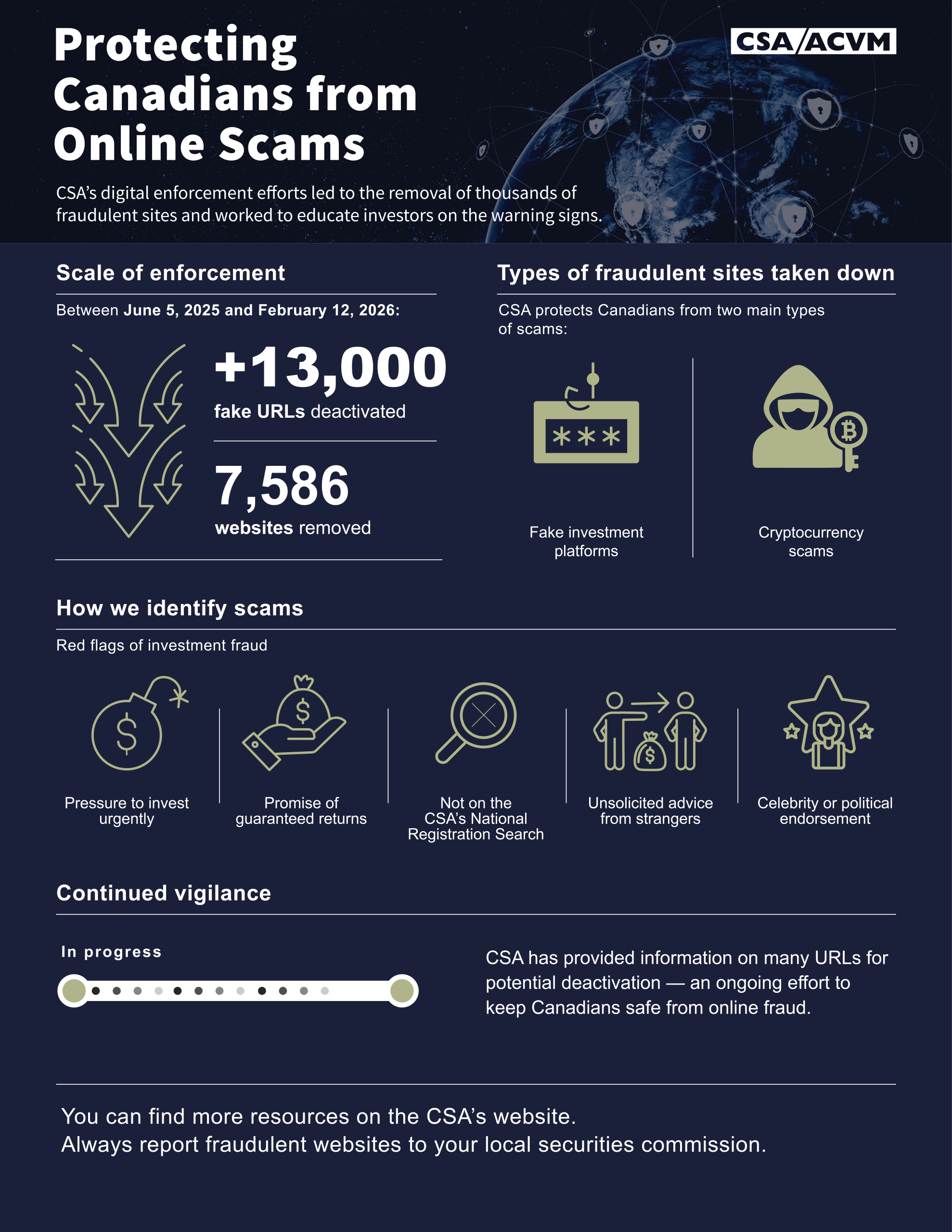 CSA’s digital enforcement efforts led to the removal of thousands of fraudulent sites and worked to educate investors on the warning signs.